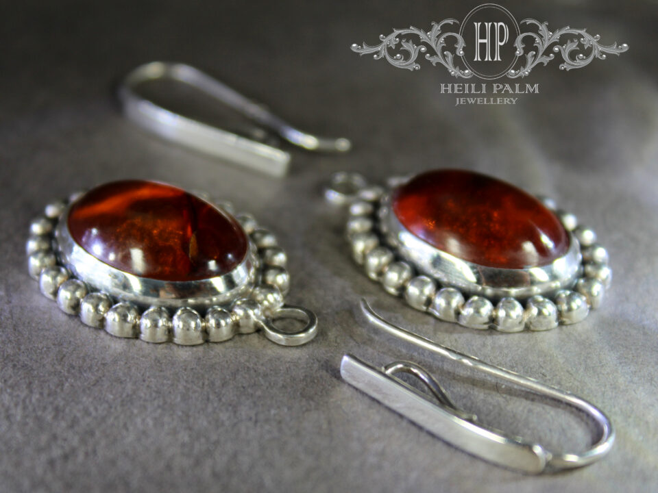 Algne hind oli: 380,00 €.300,00 €Current price is: 300,00 €.Hõbedast valmistatud ja graanulitega kaunistatud rippuvad kõrvarõngad merevaiguga.