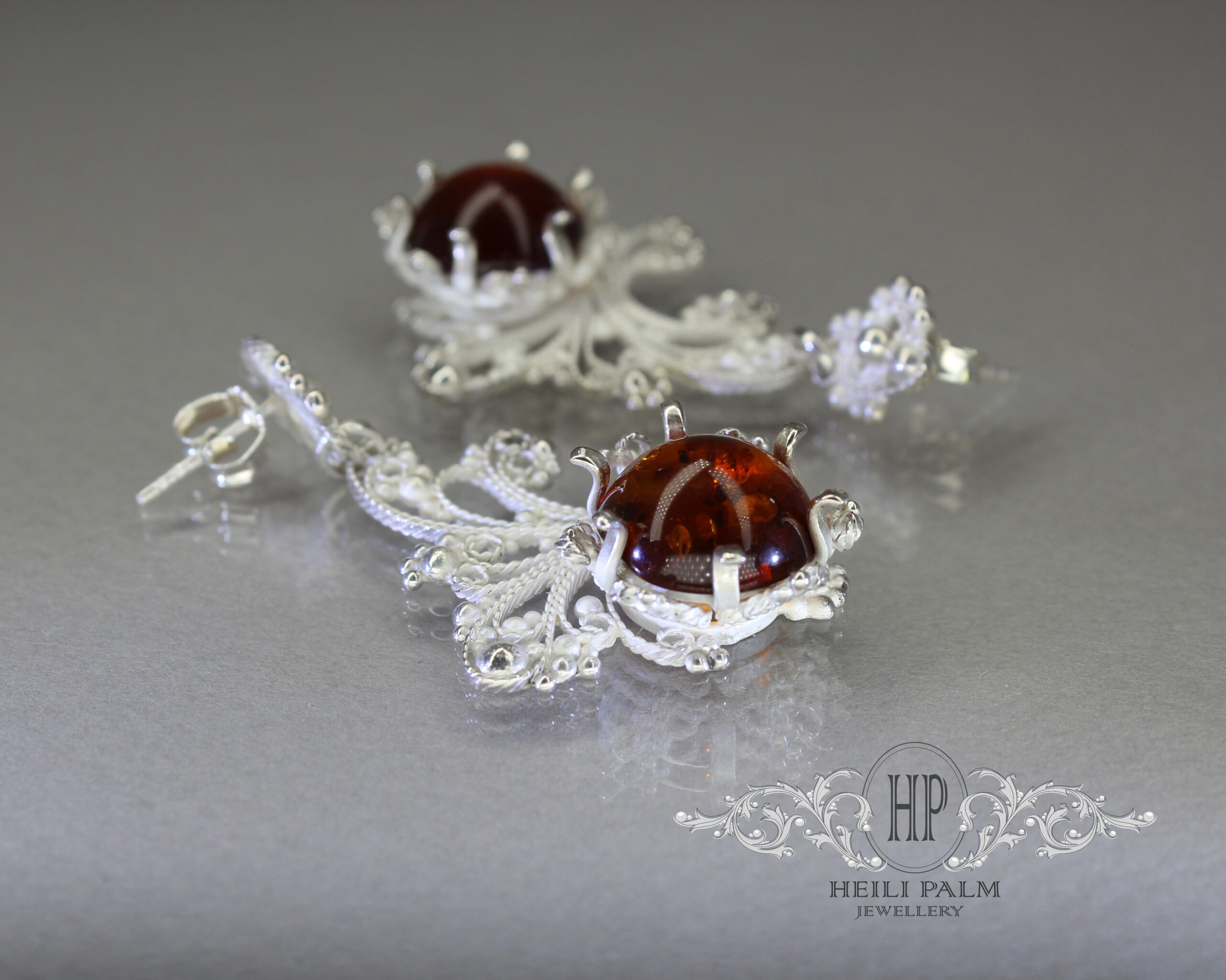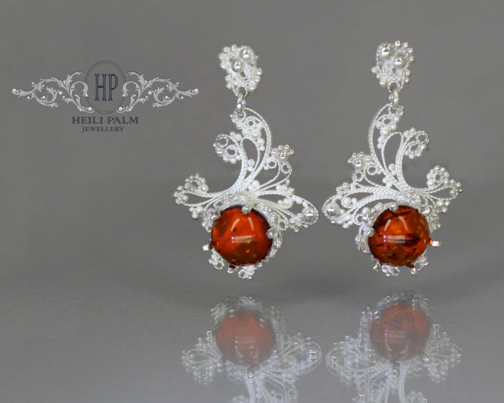 Filigraan kõrvarõngad tiftiga, 925 hõbe ja merevaik “Glacies Filigra”