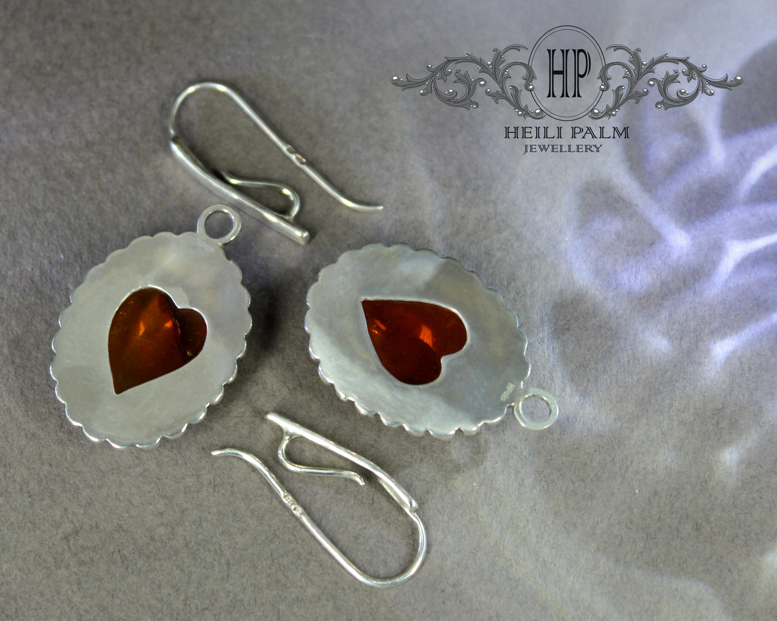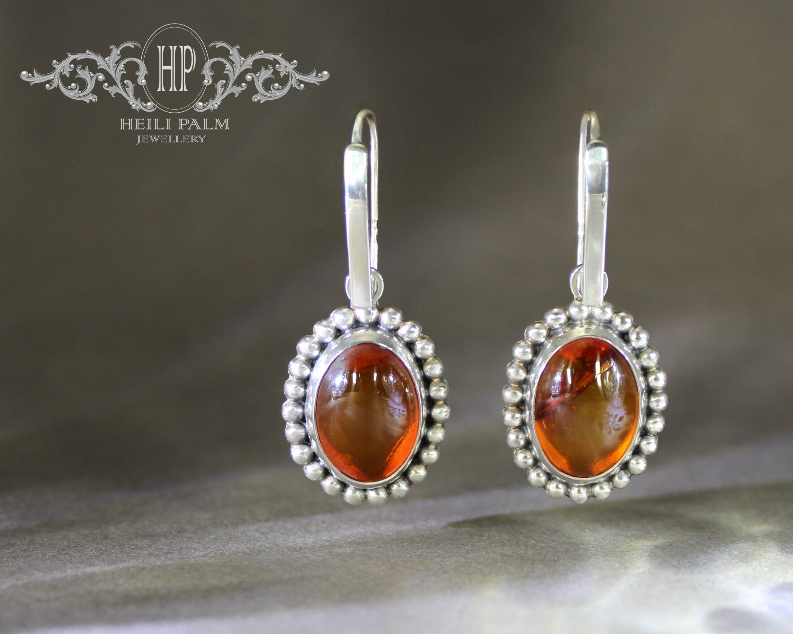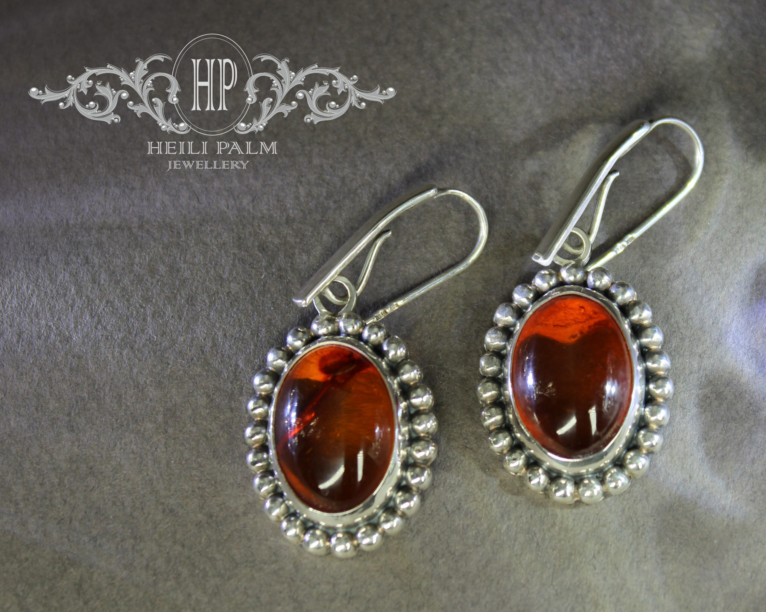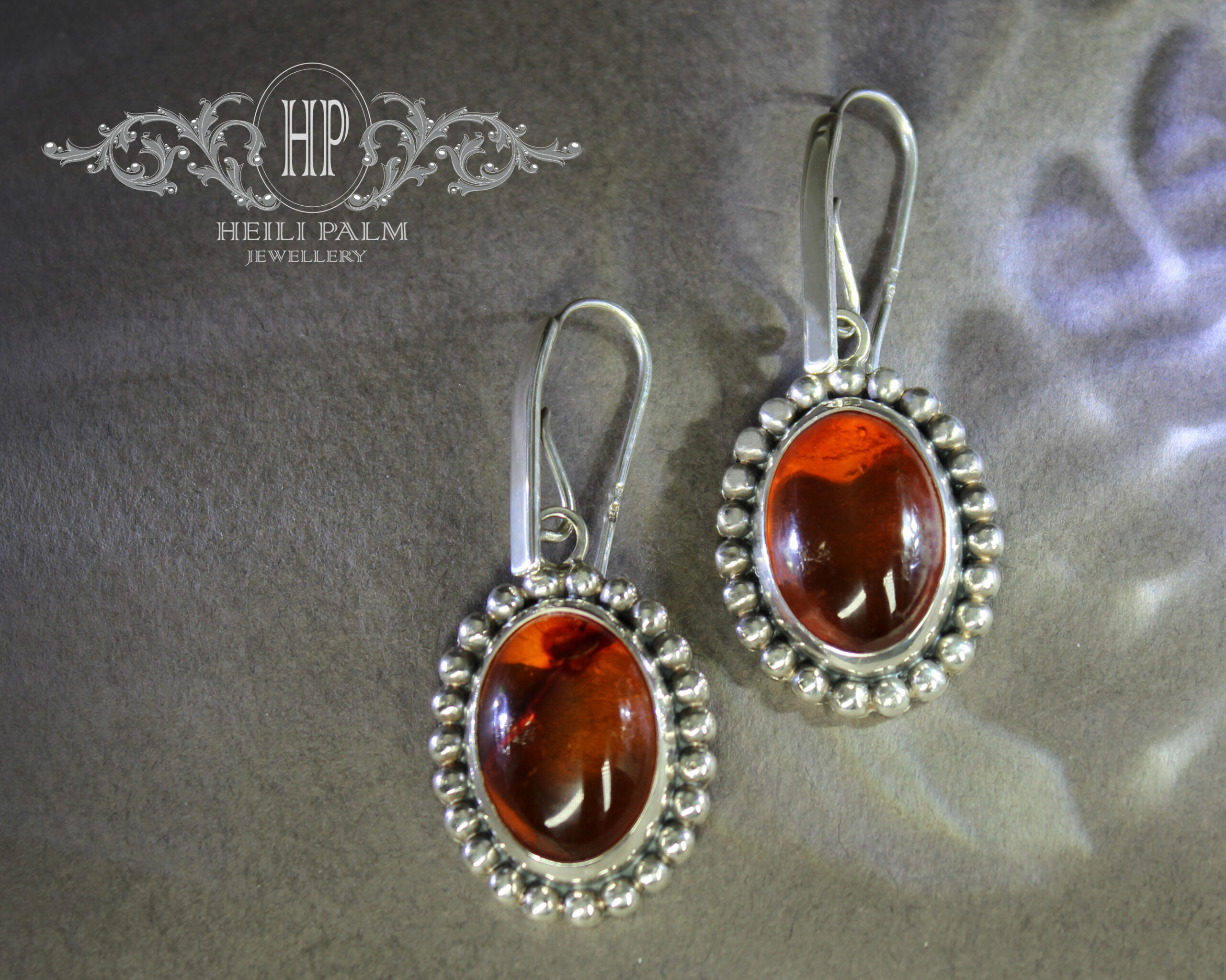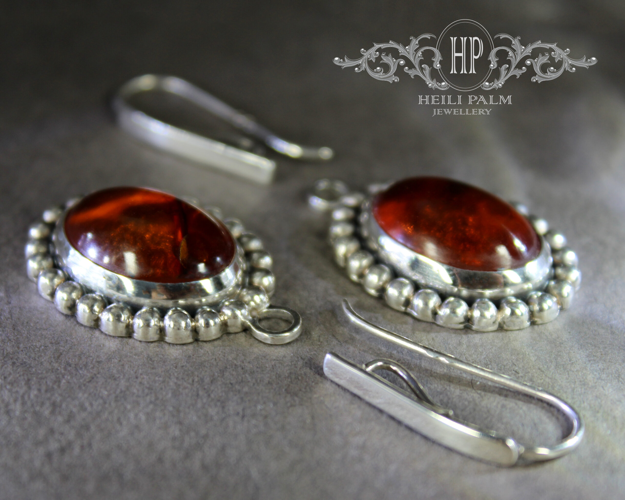 Hõbedast valmistatud ja graanulitega kaunistatud rippuvad kõrvarõngad merevaiguga.